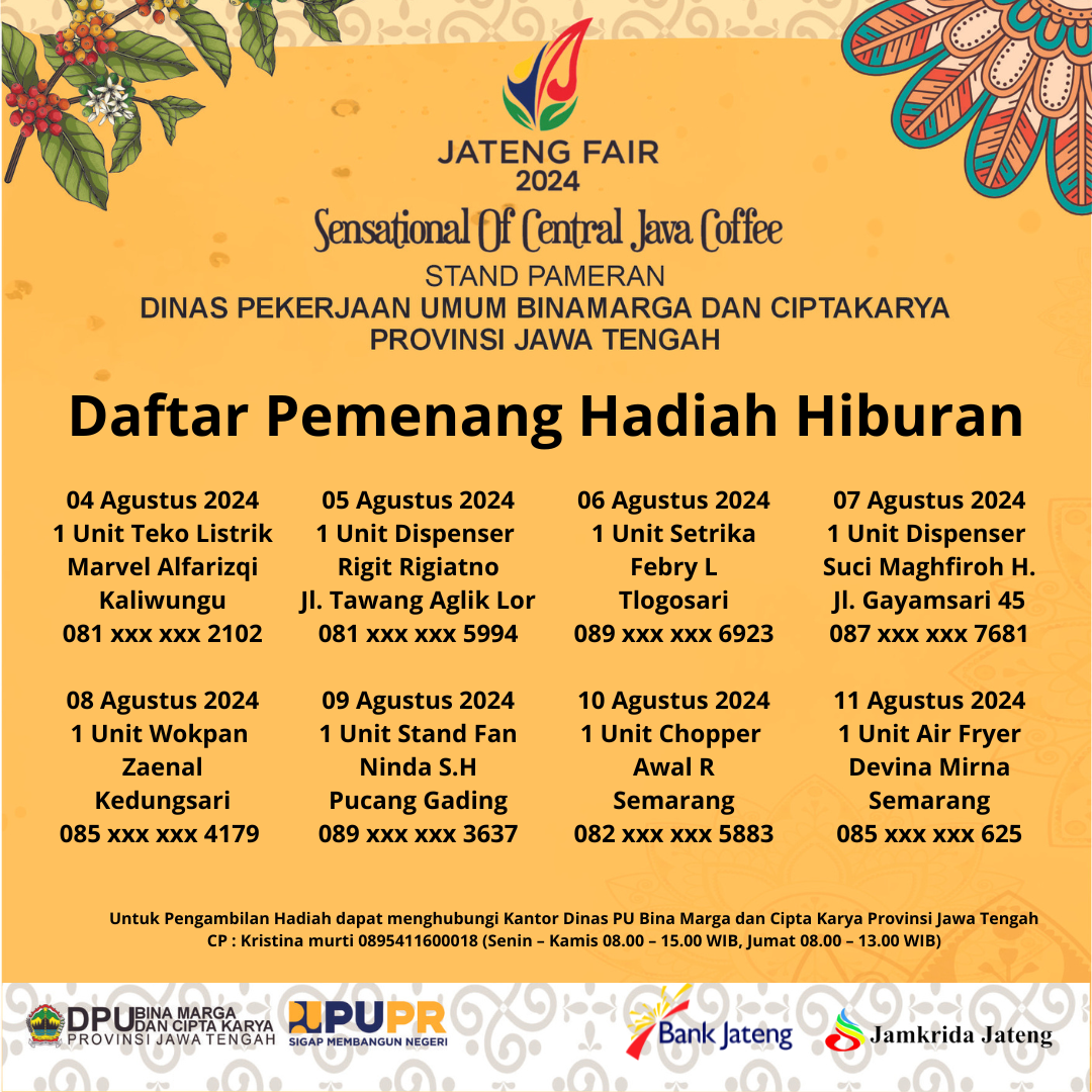 Berikut daftar pemenang Undian Doorprize Hadiah Harian dan Hadiah Utama. Selamat kepada para pemenang. Untuk Pengambilan Hadiah dapat menghubungi Kantor Dinas PU Bina Marga dan Cipta Karya Provinsi Jawa Tengah. Contact Person: Kristina murti 0895411600018 (Senin – Kamis 08.00 – 15.00 WIB, Jumat 08.00 – 13.00 WIB).